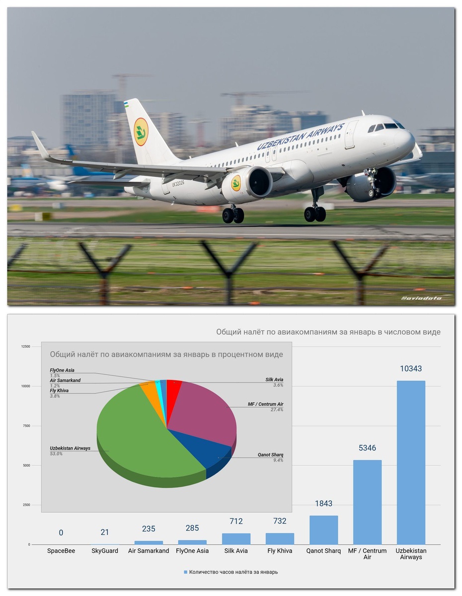 На графике представлен общий налёт по авиакомпаниям за январь, выраженный в числовом (часы налёта) и процентном виде (какую долю составляют эти часы от суммарного числа налёта всех авиакомпаний страны за январь). Авиакомпания Tashkent Air выбыла из статистики по причине приостановки действия сертификата эксплуатанта. У грузовых авиакомпаний - сезонное уменьшение количества грузоперевозок. #статистика #январь2026