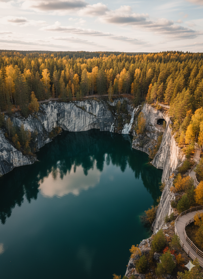 Главная жемчужина Карелии и визитная карточка всего парка — затопленный мраморный карьер с водой фантастического изумрудно-бирюзового оттенка. Ради этого вида сюда едут тысячи туристов: отвесные белоснежные скалы, отражения в прозрачной воде и ощущение полного отрыва от цивилизации.