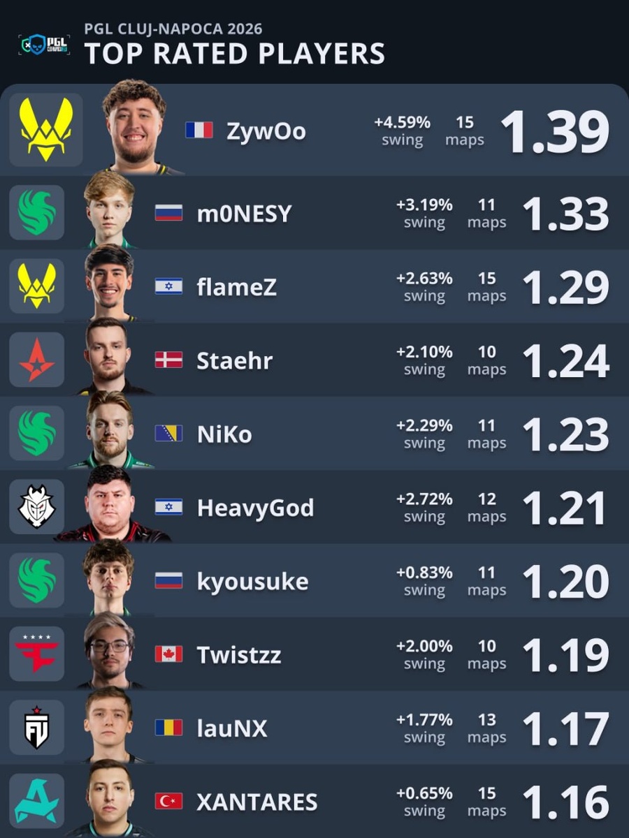 π Π’ΠΎΠΏ ΡΠ΅ΠΉΡΠΈΠ½Π³ΠΎΠ²ΡΡ ΠΈΠ³ΡΠΎΠΊΠΎΠ² Ρ PGL Cluj-Napoca 2026 ΠΏΠΎ ΠΈΡΠΎΠ³Π°ΠΌ ΡΡΡΠ½ΠΈΡΠ°