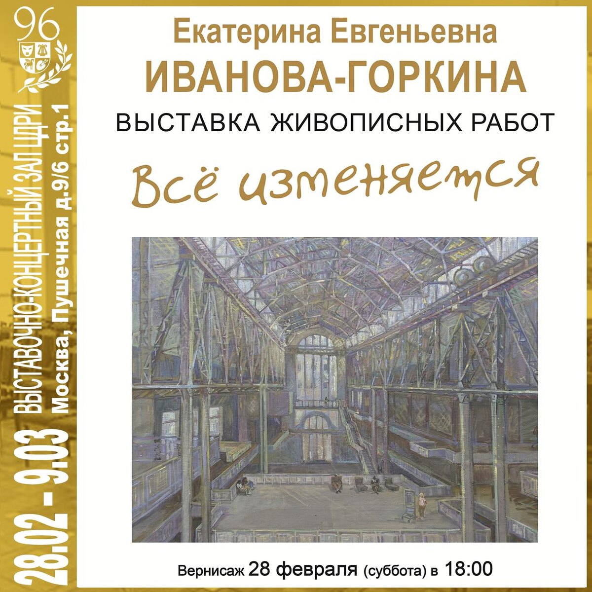 с 28 февраля по 9 марта 2026 г. Екатерина Евгеньевна Иванова-Горкина Выставка живописных работ «Всё изменяется» Вернисаж 28 февраля в 18:00 Информация, время работы и билеты на сайте: