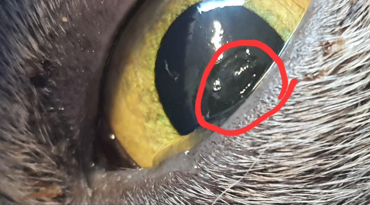 Эрозия роговицы в нижней части глаза кошки. Процесс хронический. Лечение длительное. Прогноз осторлжный.