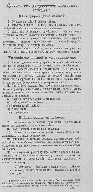 Коллеги из телеграм-канала «Чай наш советский» прислали сканы 325-го номера журнала «Разведчик», который вышел в 1897 году. И в котором был опубликован проект «Правил об устройстве полковых чайных». Были эти Правила приняты или нет, я не знаю. Но документ, в любом случае, интересный. Замечу сразу, что дореволюционная полковая чайная, а также более современный чепок, ее прямой наследник — это не чайная в современном трендовом смысле. Чайная в пункте постоянной дислокации воинской части — это столовая, буфет, клуб и магазин, причем в каждом конкретном случае какая-либо одна из функций может доминировать. Чай там есть обязательно, без него — никуда. Но чай там — не главное. А вот что главное, можно узнать из «Правил об устройстве полковых чайных». Причем буквально в первых строках (орфографию я частично осовременю, а стилистику сохраню). «Учреждение чайной имеет целью: 1) Отвлечь нижних чинов от вредных для них посещений кабаков, харчевен и трактиров. 2) Дать им возможность приобретать у