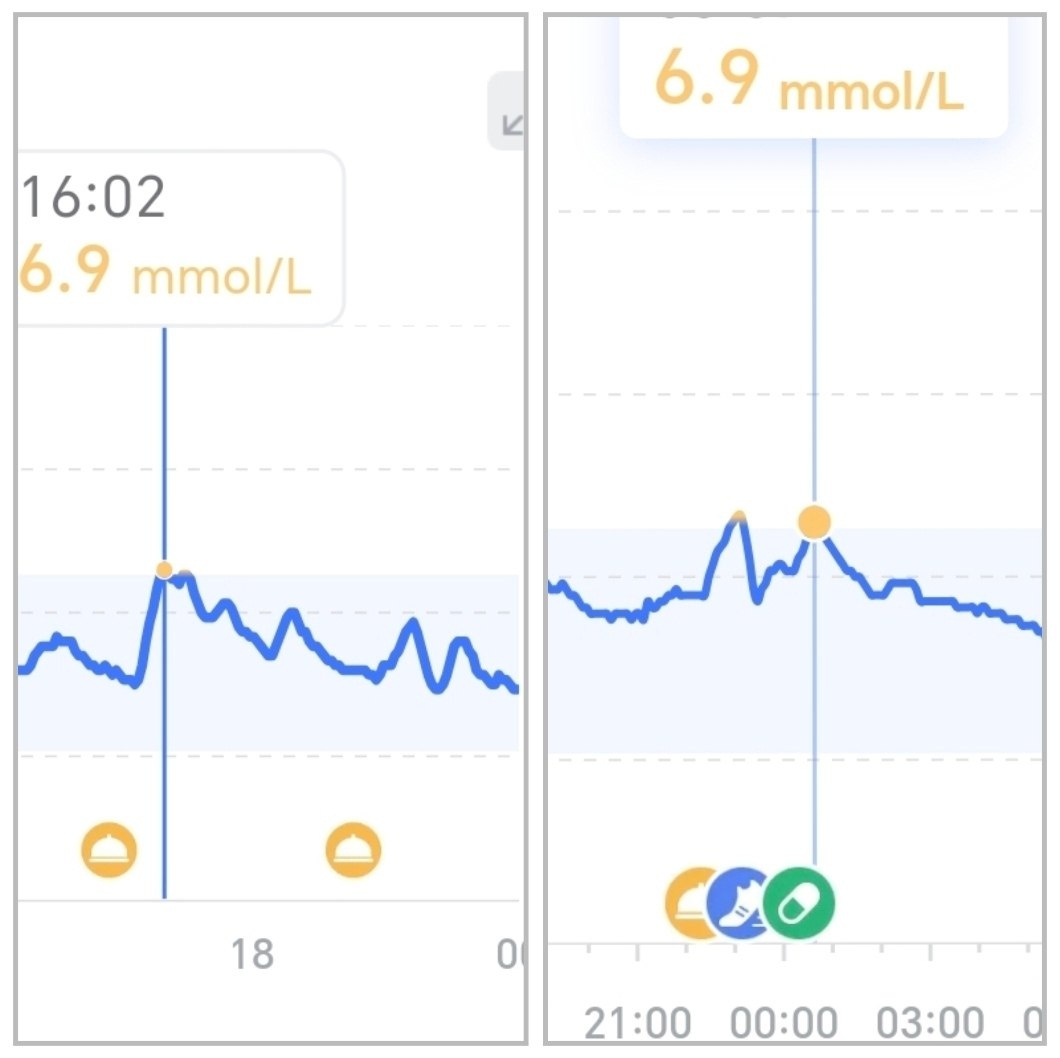 15 февраля, прекрасное кафе с поварами из Тая. Я заказываю Том ям. Очень хорош. Но глюкоза начинает стремительно рвать в вверх (график слева). У меня висит датчик глюкозы на плече и я смотрю за глюкозой практически нон-стоп. Идет лекция, я встаю, иду за самый дальний ряд и начинаю делать махи ногами назад, потому что приседать было как-то неудобно, уходить с лекции не хотелось, а повышающаяся глюкоза меня очень расстроила. Я люблю вкус Том яма. После того, как глюкоза стояла как вкопанная полчаса, а я махала ногами удерживая ее на уровне 6,9 ммоль/л я, конечно, Том ям внесла в список запрещенки. Любое движение, совершенное крупными мышцами может снижать глюкозу в крови, поэтому самое правильное правило: съела что-то сладкое — иди. Просто вставай и иди ))) Или приседай. Должны быть заняты мышцы выше колена и ниже талии, они отлично утилизируют лишнюю глюкозу. Научный эксперимент обладает воспроизводимостью, правда ведь? И я, как преданный науке человек, 22 февраля заказала суши. Обычные