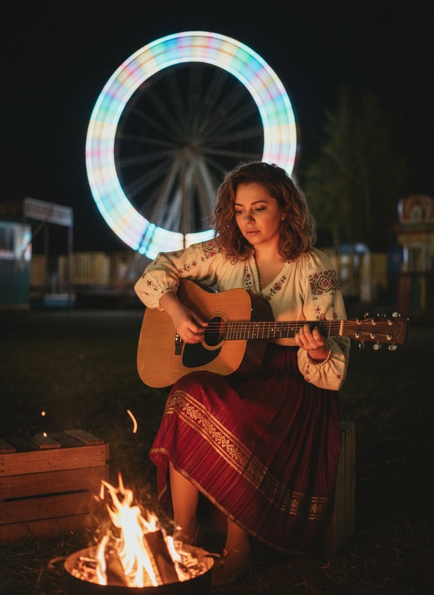 🎨 Промпт: A portrait of the woman from the reference photo, her facial features and likeness unchanged. She is seated in a quiet, forgotten corner of a nocturnal carnival at night, soft pastel lights of dormant rides blurring into gentle streaks in the long exposure. She wears a traditional cultural costume, a beautifully embroidered blouse and skirt, illuminated by the flickering warmth of a small, contained campfire before her. Her mood is melancholic and introspective as she strums an acoustic guitar, lost in the music, the mid-morning soft light replaced by the ghostly trails of the distant, silent Ferris wheel behind her. Cinematic, intimate, shot with a shallow depth of field, warm tones. Банк Промптов | Твои Идеи