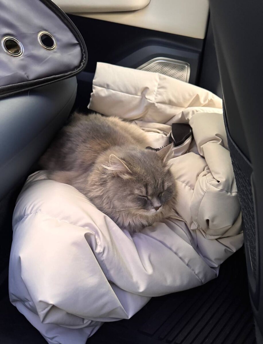 Ехать обратно домой Бетти⚜️ предпочла на мягком и удобном пуховике Детеныша