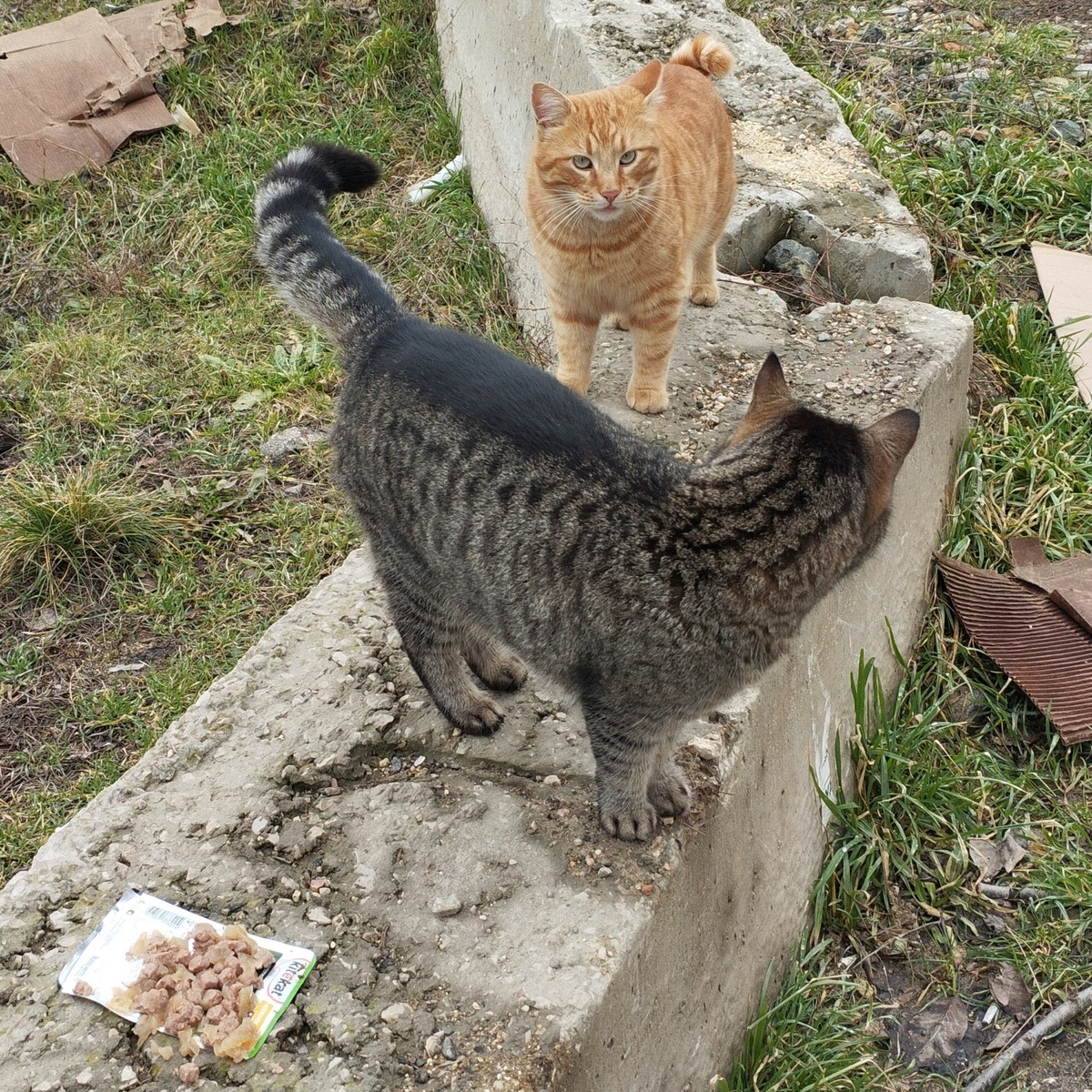 Сегодня 23 февраля и гаражная кися решила угостить своего рыжего друга. Пока она отвлекает двуногого на няш-мяш и погладь-помурчу, кавалер освоился и уплетает за обе щеки. С праздником! 🍾🎉🫡 Которепортёр