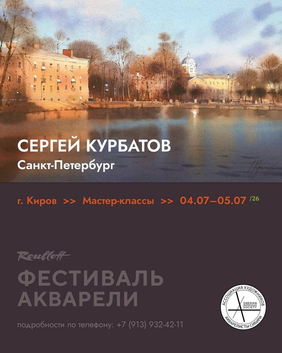 для участников фестиваля ROUBLOFF проведёт студийные мастер-классы 4 и 5 июля в составе полной программы мероприятий. Многократный участник и призёр отечественных и международных выставок, в том числе во Франции, Бельгии, Китае. Персональные выставки в Лондоне, Апельдорне, Санкт-Петербурге, Новосибирске. Многие работы хранятся в частных коллекциях в России, Европе, США, Японии. Автор книги «АКВАРЕЛЬНЫЙ ДЖАЗ Сергея Курбатова». Эти насыщенные событиями 8 дней станут незабываемым праздником акварели для каждого участника! Ежедневное общение с наставниками и единомышленниками, уроки акварели, экскурсии и серия мероприятий свободного посещения завершится камерным уроками этого потрясающего мастера! Не упустите возможность присоединиться к фестивалю Roubloff, узнайте подробности на сайте и по телефону: 89139324211.