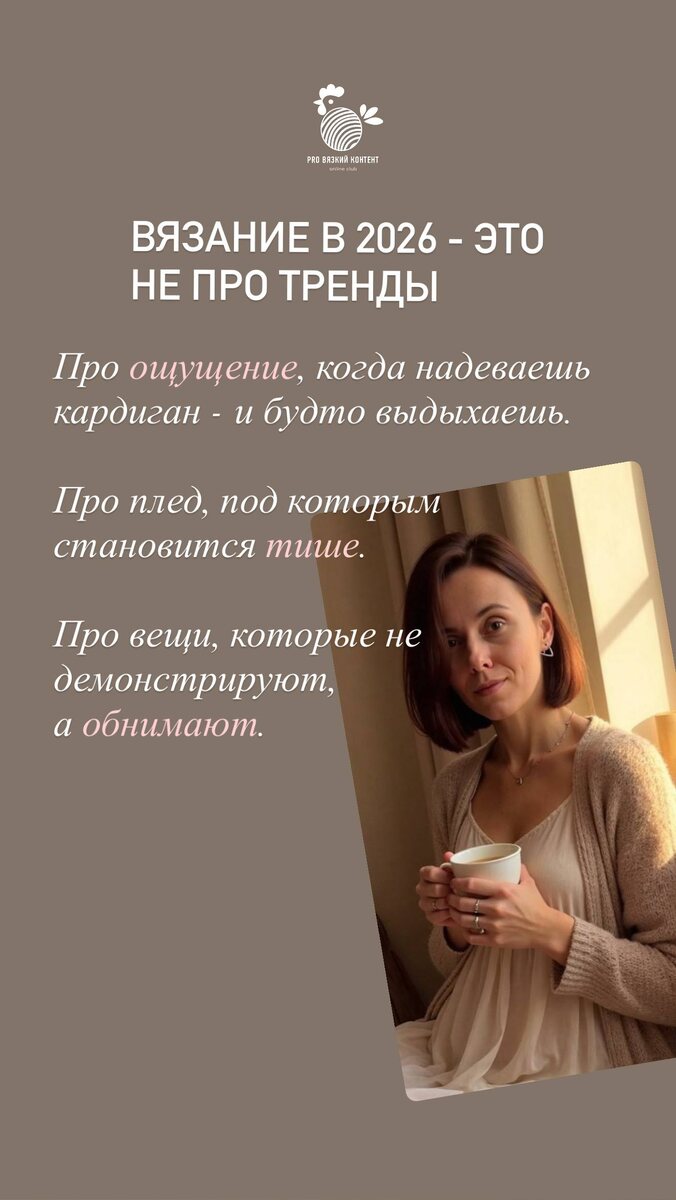 : в 2026 году “модно” больше не продаёт. Об этом говорим на каждом эфире внутри нашего клуба Pro Вязкий Вам тоже расскажу немного ⤵️ Продаёт другое: • Тепло • Спокойствие • Ощущение “я дома” Если вы всё ещё думаете, что нужно гнаться за трендами - эта карусель может вас удивить 🥺 Листайте. Будет интересно и полезно 🤍