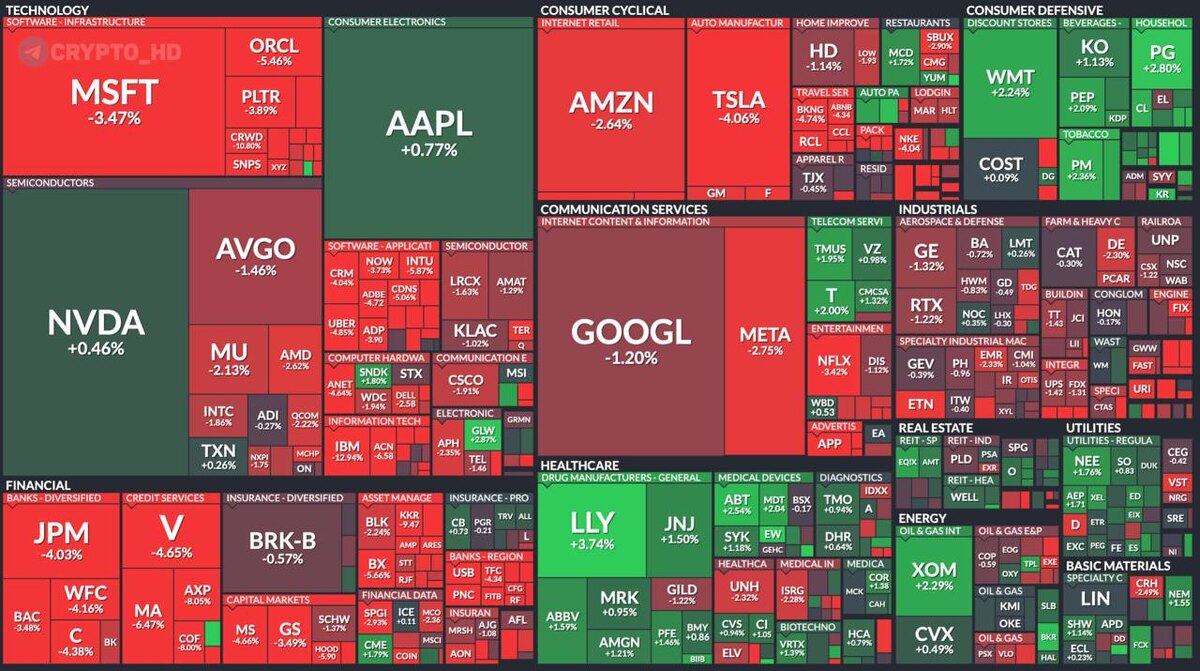 ➠ S&P 500 -1,14%, Nasdaq -1,36%, Золото выше $5200. ➠ Bloomberg: Рынок накрыла волна распродаж – инвесторы нервничают из-за угрозы AI для корпоративных прибылей и новых торговых пошлин. ➠ Сильнее всего достается технологическому и софтверному сектору. ETF на акции программных компаний теряет 5% – худший месяц с 2008 года. Акции IBM обвалились на 11%, максимальное снижение с марта 2020 года. ➠ DoorDash и American Express просели более чем на 6,5%. Поводом послужил аналитический отчет Citrini Research – AI угрожает сразу нескольким отраслям. ➠ После того как Верховный суд отменил «взаимные» тарифы Трампа, Белый дом объявил о замене: единый сбор в 15% на весь американский импорт. Тарифная неразбериха, судя по всему, останется главным раздражителем для рынков до конца года. ➠ Капитал перетекает в защитные активы: облигации дорожают, доходность 10-летних трежерис опустилась до 4,03%. ➠ На этой неделе в фокусе: обращение Трампа к Конгрессу, отчет Nvidia в среду и данные PPI в пятницу.