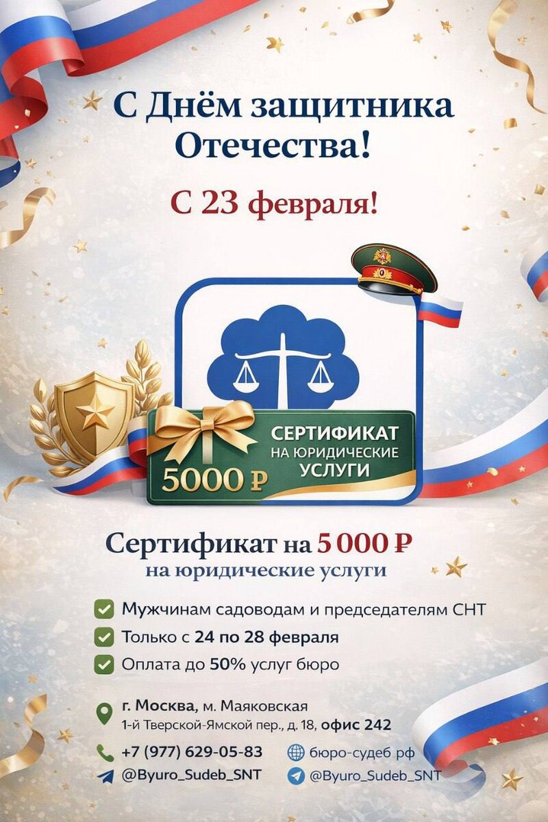 ! Дорогие мужчины — садоводы, председатели СНТ и все наши клиенты, которые доверяют нам решение своих правовых вопросов! Поздравляем вас с 23 Февраля. Желаем непоколебимой твёрдости в решениях, юридической подкованности и абсолютной стабильности во всех делах! ⚖️🛡 🎁 Подарок от «Бюро Судеб» В честь праздника мы подготовили для вас подарок — Сертификат на 5 000 рублей на юридические услуги нашего бюро. 📜 Условия акции: ✅ Для кого: Строго для мужчин (частных лиц, садоводов и председателей). ✅ Срок действия: При оплате услуг по заключенному договору в период с 24 по 28 февраля 2026 года. ✅ Как использовать: Сертификатом можно оплатить до 50% от общей суммы договора. Пусть ваши границы — и земельные, и личные — всегда будут под надёжной защитой закона! 🤝 --- 📍 Ждем вас в нашем офисе: г. Москва, м. Маяковская, 1‑й Тверской‑Ямской пер., д. 18, офис 242 (2-й этаж, вход через 2-й подъезд). 📲 Связаться с нами: • Телефон / WhatsApp / Telegram: +7 (977) 629-05-83 • Сайт: бюро-судеб.рф