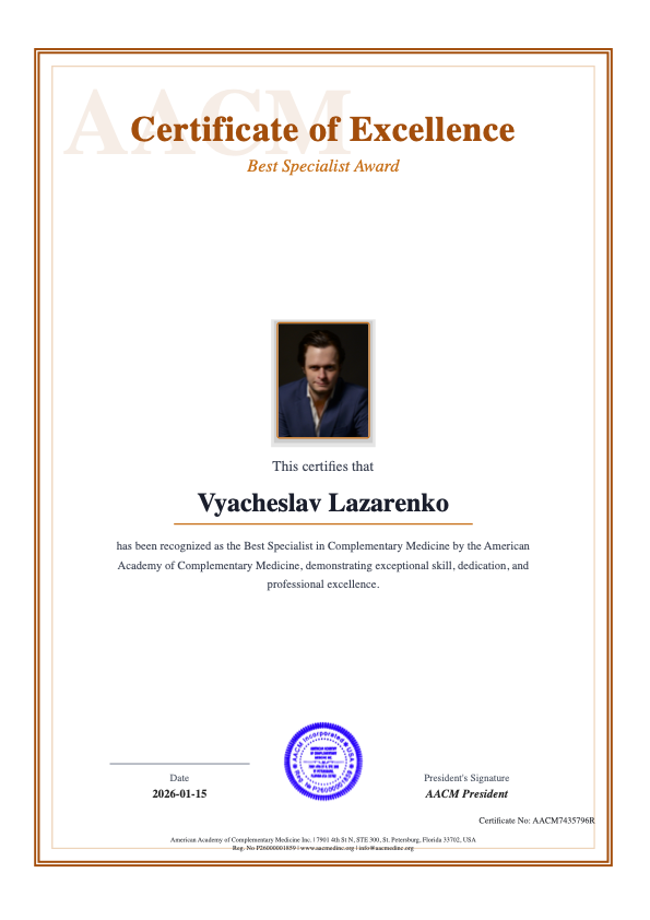 15 января 2026 г. Вячеслав Лазаренко, президент Российской ассоциации специалистов нетрадиционной медицины и оздоровительных практик, основатель Инициологии, удостоен престижной награды «Лучший специалист в области комплементарной медицины» — и на то есть серьёзные научные основания. Разберёмся, почему решение экспертного совета AACM так значимо. Что проверили эксперты Экспертный совет AACM провёл систематический анализ индивидуальных медицинских карт (историй болезни пациентов), проходивших сеансы у В. Лазаренко в период с 2001 по 2025гг. В каждой истории были: Среди диагнозов пациентов — самые разные патологии, в том числе те, что плохо поддаются стандартной медикаментозной терапии: Анализ данных показал: Чтобы убедиться в научной обоснованности результатов, эксперты провели строгую проверку: Результат: Случаев фальсификации данных не выявлено. Объём систематизированных клинических данных — беспрецедентный для одного специалиста в области комплементарной медицины. Аналогичн