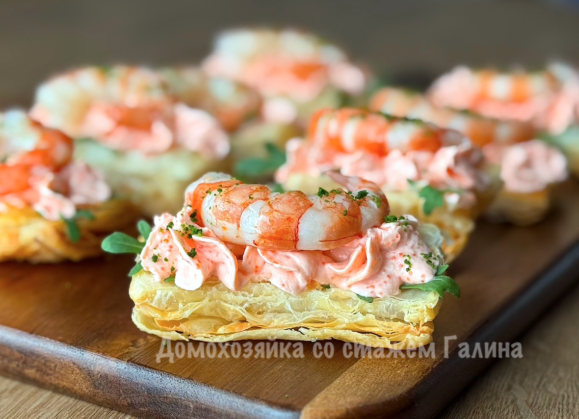 Эта закуска понравится тем хозяюшкам, которые не дружат с выпечкой или просто не имеют времени. Покупное тесто всегда выручает в такие моменты. Конечно, эти вкусные продукты можно выложить на ломтики хлеба, и будет тоже замечательно, но вы попробуйте приготовить именно так. В своём рецепте я использую икру масаго, она в меру соленая, мелкая и хрустящая. Купила её в супермаркете, но точно скажу: есть она не везде. Можно заменить на икру щуки, сельди или минтая. Конечно, такого яркого цвета не будет, но вкус она передаст однозначно. Не стала бы советовать икорные пасты в баночках, у них слишком яркий вкус, который перебьёт нежность креветок. Масаго — это мелкая хрустящая икра мойвы, которую так любят в японской кухне. Ею украшают суши, роллы (знаменитую «Калифорнию») и гунканы. У икры нежный солоноватый вкус и природный светло-бежевый оттенок, но для красоты её часто подкрашивают в оранжевый, красный, зелёный (под васаби) или чёрный цвета. Итак, приступаем. Бездрожжевое слоёное тесто вы