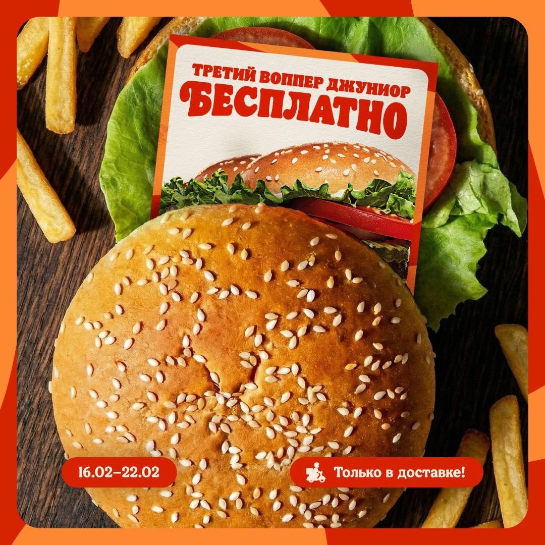 🥘 Несем вам сюрприз между булочек. Мы о купоне на третий Воппер Джуниор. А вы о чём? Подгон доступен только в доставке, активируйте его на сайте или в приложении. 📶 Категория: Ресторан 🏢 Кафе Бургер Кинг 📍 г. Чехов, ул. Московская, д. 96, этаж 4 ⏱ Часы работы: Пн - Вс 10:00 – 22:00 ⭐Разместить публикацию ⭐Поддержать голосом ✅ Где поесть, Чехов!? https://dzen.ru/id/670a701b353dbb6d0fb04a97 http://vk.com/gdepoestchekhov http://dzen.ru/gdepoestchekhov