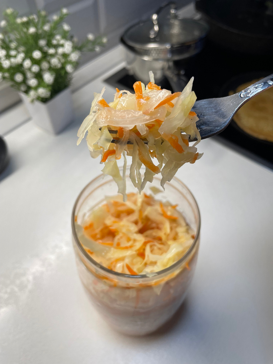 На фото капуста, которую я квасила на прошлой неделе. На 4-й день она уже была готова и я убрала ее в холодильник.