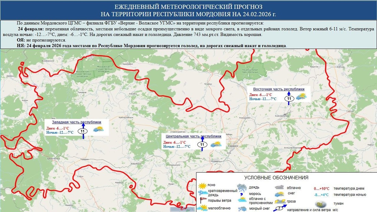 ☁️⛅⛈️ 24 февраля в Мордовии переменная облачность, местами небольшие осадки преимущественно в виде мокрого снега, в отдельных районах