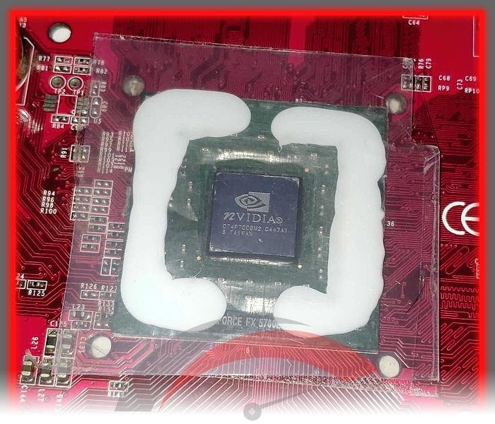 Как и всегда. Уровень кристалла идеально совпадает с уровнем самодельной защитной рамки. Такого практически невозможно добиться обычными накладными прокладками. Особенно при обилии SMD деталей на текстолите. Важно заметить, что эта защитная рамка не только защищает от сколов, но и распределяет нагрузку от радиатора по всей площади чипа, что значительно снижает риск возникновения «отвала» GPU по вине деформации из-за систем охлаждения.