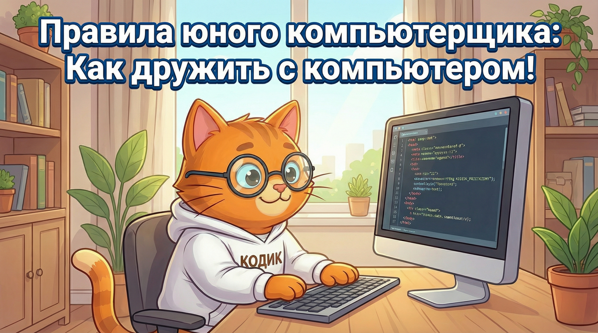 Привет, мой юный друг! Компьютер – это очень умный и полезный помощник. Чтобы он всегда радовал нас, а ты был здоров и весел, запомни простые правила работы за ним: 1. Чистые ручки – залог успеха! Прежде чем начать работать, убедись, что твои руки чистые и сухие. Это важно для твоего здоровья и для компьютера. 2. Начинай работу только с разрешения учителя! Не включай компьютер сам и не начинай задание раньше времени. Всегда дождись, пока учитель скажет: “Можно начинать!”. 3. Сиди правильно, как настоящий ученик! Спина прямая, не сутулься. Ноги стоят на полу или на специальной подставке. Расстояние от твоих глаз до экрана должно быть как твоя вытянутая рука (примерно 50-60 см). 4. Будь осторожен с проводами! Не трогай провода и не дергай их. Если какой-то провод отсоединился, сразу позови учителя. 5. Нет еде и напиткам возле компьютера! Возле компьютера не должно быть воды, сока, печенья или конфет. Маленькая капля или крошка могут навредить технике. 6. Работай аккуратно, не стучи! Не с