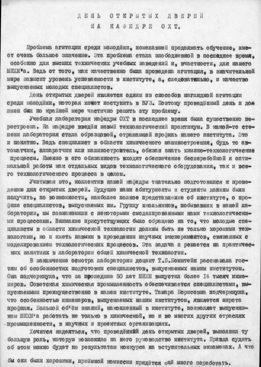 Она подчеркнула, что за прошедшие 50 лет МИХМ выпустил более 14 тысяч инженеров. Советская химическая промышленность обеспечивается специалистами, выпускаемыми преимущественно в нашем институте. Тамара Борисовна подчеркнула, что особенностью инженеров, выпускаемых нашим институтом, является широта профиля . Большой об'ём знаний , накопленный в институте, позволяет выпускникам МИХМ'а работать не только в химической, но и во многих других отраслях промышленности , в научных и проектных организациях .