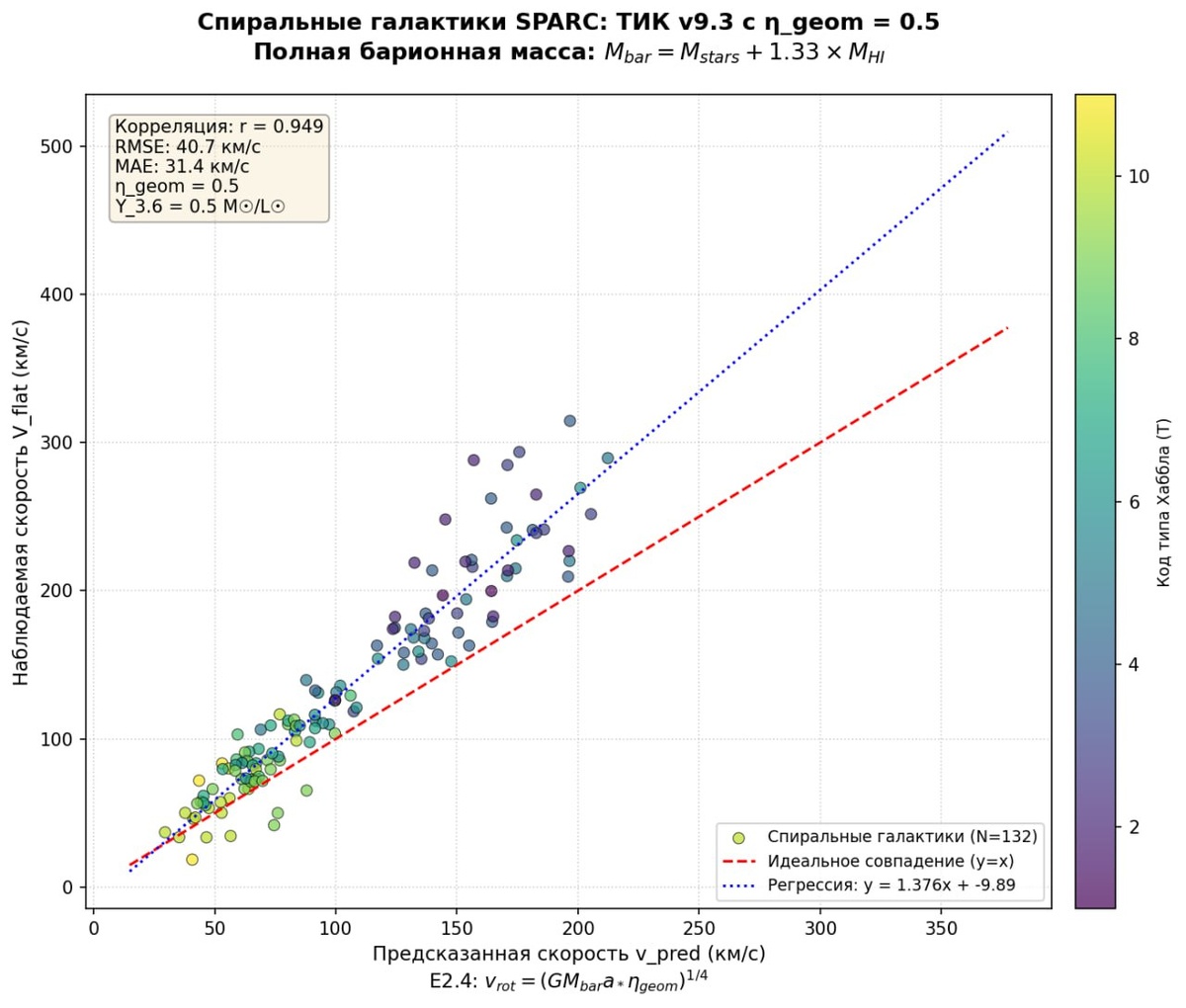 : [2/3] Построение графика для спиральных галактик... ✅ График сохранён: D:\Pyton\spiral_galaxies_tik_v9.3_baryonic.png 📊 Статистика (спиральные, η_geom=0.5): • N = 132 галактик • Корреляция: r = 0.949 • RMSE: 40.7 км/с • MAE: 31.4 км/с 🔍 Диагностика масс: • M_stars диапазон: 6.00e+06 – 2.02e+11 M☉ • M_gas диапазон: 8.91e+07 – 5.33e+10 M☉ • M_baryon диапазон: 9.51e+07 – 2.55e+11 M☉ • Доля газа: 19.7% [3/3] Интерпретация... ✅ ТИК v9.3 согласуется с данными SPARC для спиральных галактик E2.4 с полной M_baryon и η_geom = 0.5 воспроизводит кривые вращения ☝️Дальше будем вот это изучать - Следствие: При одинаковой барионной массе спиральные галактики должны иметь скорости вращения ~16% ниже эллиптических. Это предсказание требует проверки на каталоге с эллиптическими галактиками. 😂 Для тех полутора человек которые понимают о чём это 😂 ‼️Зы если кто-то знает где найти нормальный каталог элиптических галактик напишите мне в личку. По другим каталогам тоже.