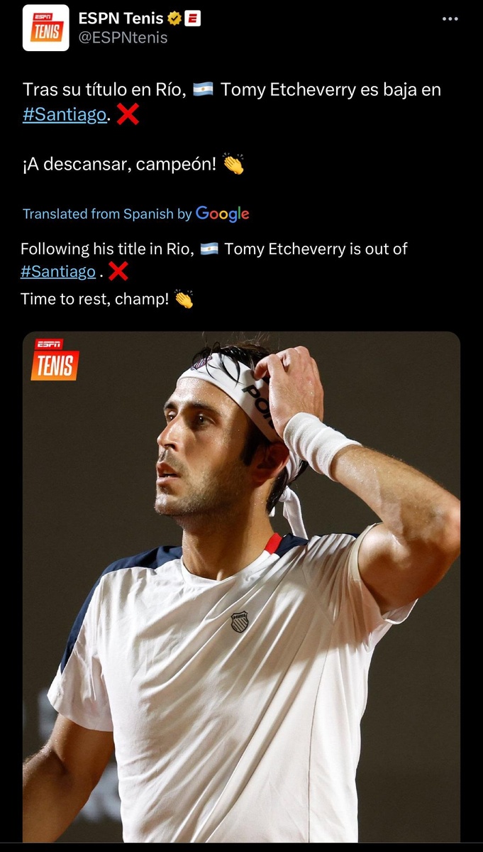 Томи Этчеверри снялся с турнира в Сантьяго после своего первого титула ATP в Рио и напряженного Golden Swing.