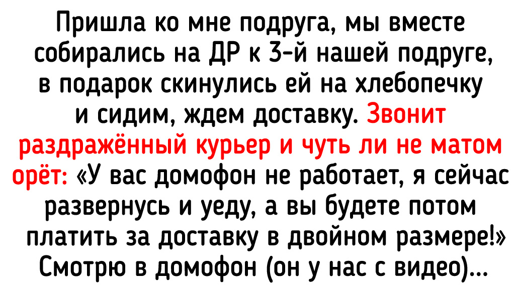 Меня угораздило заказать доставку пылесоса курьером. В назначенный день он позвонил мне 1 раз на телефон, я не успела ответить. Перезваниваю — не берет. Когда всё-таки дозвонилась, он заявил, что уже уехал из моего района. А в домофон позвонить не пробовал??? Пришло сообщение, что попытка доставки не удалась. Эта попытка, если что, длилась 17 секунд. © Феникс / Dzen Я беременная, жду кроватку с курьером. Звонит: «Открывайте! Мы у вашей двери!» Открываю — никого нет. Они ушли в корпус 2, на этаж 16, всё как у меня. Я им объяснила. Курьер начал на меня кричать! Он устал тащить кроватку на 16 этаж и больше не собирается это делать, оставит её на улице у подъезда. Я в шоке. Я тут при чём? Нужно звонить в домофон, прежде чем подниматься к клиенту. В итоге скандалист остался в машине, а его второй напарник сам поднял мне кроватку. Нормальный человек, посмеялся, извинился. © Юлия Полякова / Dzen Недавно ждала доставку. Звонит курьер, мол, я подъезжаю. Я ему повторяю номер дома и квартиры. Он