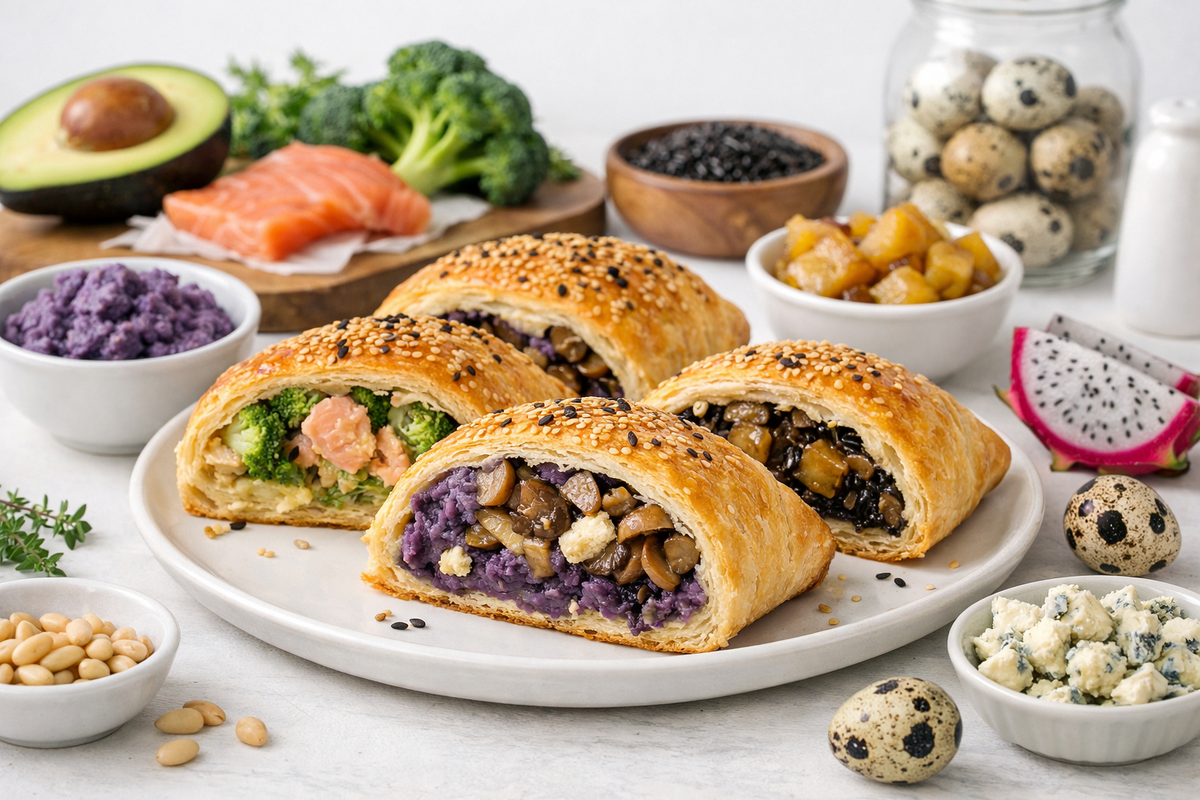 Подавайте такие слойки теплыми на деревянной доске или светлой тарелке. Рядом можно поставить ложку густого йогурта или мягкий сливочный соус - получится очень уютно и по-домашнему, но с красивой "ресторанной" подачей.