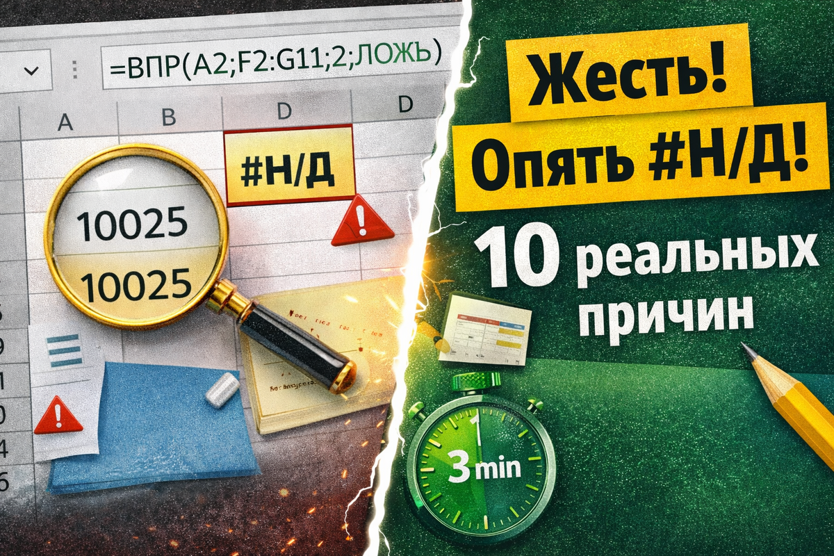 Ошибка #Н/Д в Excel — причины и пошаговое решение. Почему в Excel появляется ошибка #Н/Д: несовпадение типов данных, скрытые пробелы, диапазоны, частичный поиск, ВПР и ПОИСКПОЗ. Полная диагностика + файл для практики.
