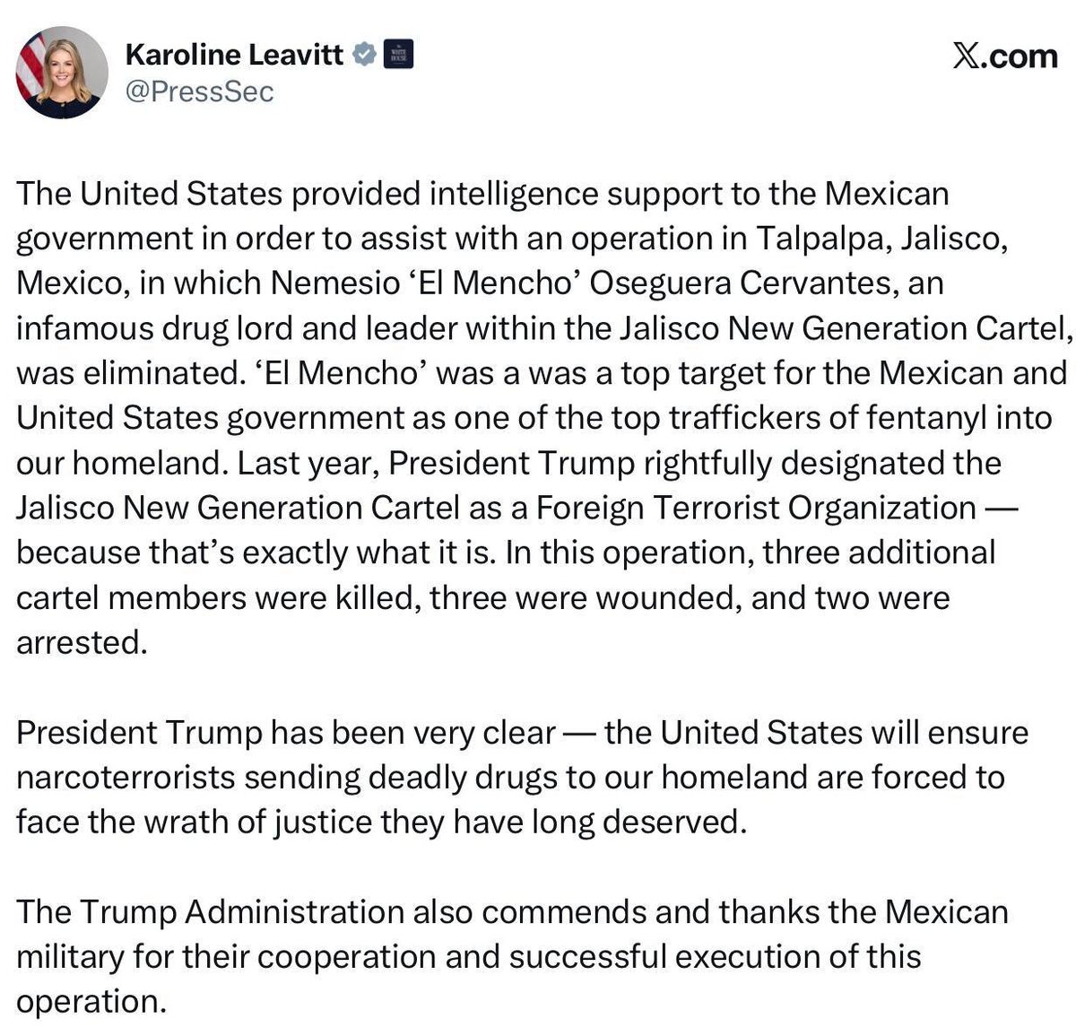 Пресс-секретарь Белого дома Левитт заявила, что США предоставили разведывательную поддержку мексиканским властям в ходе спецоперации в Тальпа-де-Альенде. По её словам, целью операции был Немесио "Эль Менчо" Осегера Сервантес — предполагаемый лидер картеля "Jalisco New Generation" (CJNG), которого в Вашингтоне считают одним из ключевых фигур в поставках фентанила в США. В заявлении также отмечается, что в ходе операции были убиты ещё трое предполагаемых членов картеля, трое получили ранения и двое были задержаны. Ранее администрация Трампа внесла CJNG в список иностранных террористических организаций. Независимых подтверждений всех деталей операции на данный момент не представлено; официальные комментарии мексиканской стороны могут уточнить обстоятельства произошедшего. #США #Мексика #CJNG #Безопасность #Наркокартели ✈️ Будь с нами - поделись с друзьями: Хвитторная