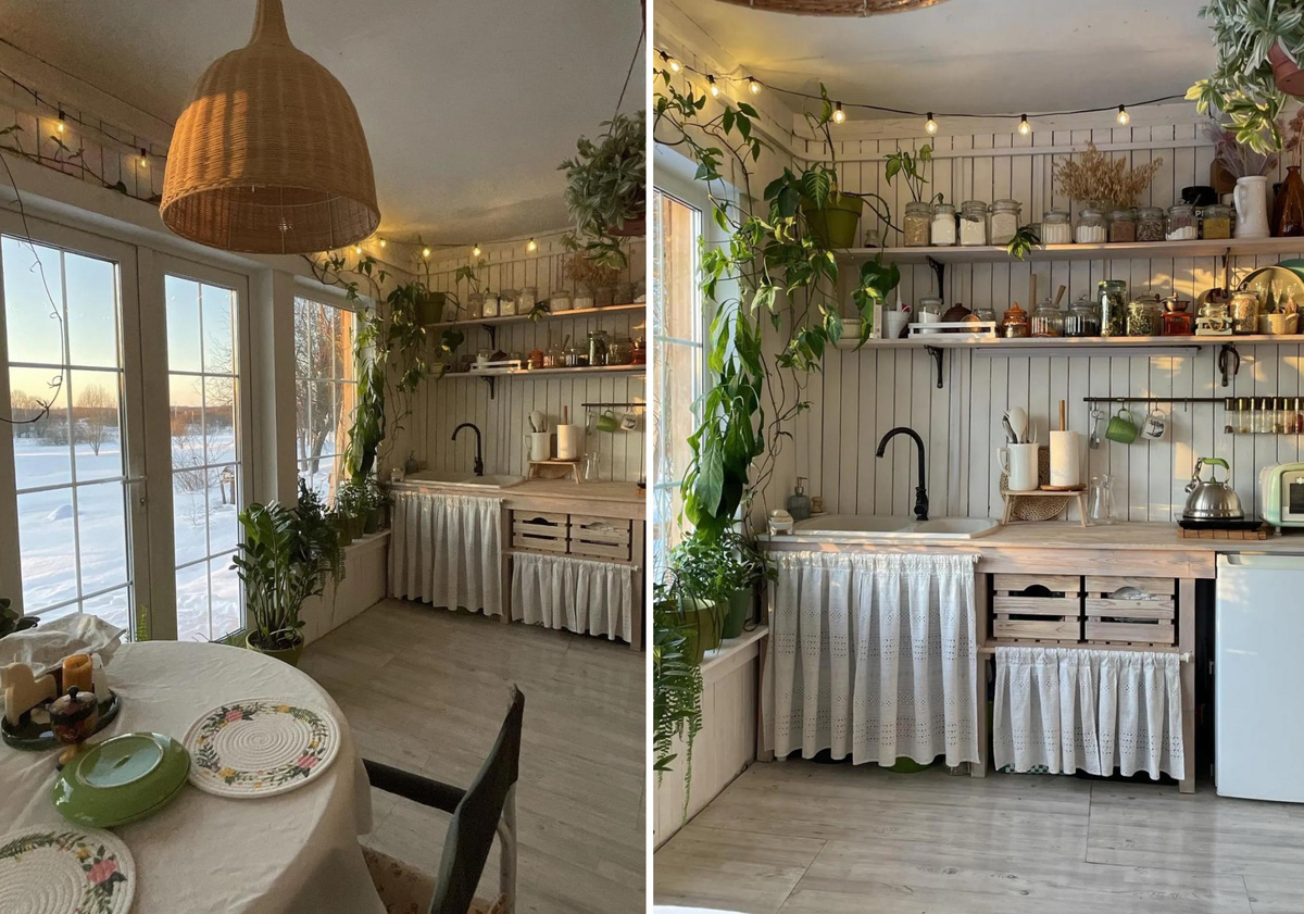 Хозяйка этой интересной кухни — девушка по имени Аля. В 2023 году они с мужем купили участок на берегу озера и построили каркасный дом. Для кухни выделили самое большое и светлое помещение.