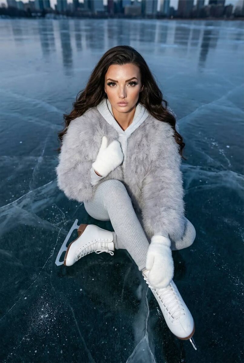 ❤️ Ultra-realistic high-fashion winter editorial, luxury minimal sensuality. Winter evening. Blue hour. Medium portrait shot, tight crop. Extreme top-down angle — camera positioned directly above the subject. The girl is sitting on perfectly clear frozen ice, body slightly turned diagonally. She looks straight up into the camera with a piercing, confident gaze. Strong eye contact, calm dominance, controlled sensuality. One hand gently grips the edge of her short fur coat near the collar. The other hand rests loosely and elegantly on the white figure skates. Location: wide frozen lake with smooth glass-like ice surface, subtle natural cracks and reflections, distant city skyline completely blurred and barely visible, clean open space, no distractions. Lighting: hard direct flash photography from above, high contrast, sharp shadows, ice surface reflecting light upward, clean luxury editorial lighting. Hair: extremely long hair styled in polished glamorous waves, slightly spread on t
