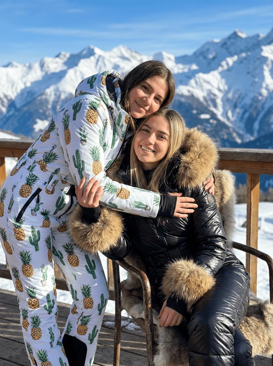 Зимний промт двух подруг на веранде в горной местности в тёплых комбезах на фоне заснеженных гор и яркого солнца