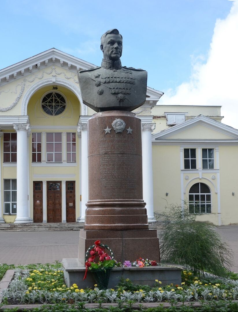 📌 75 лет назад, в феврале 1951 года, на Театральной площади Великих Лук установили бюст дважды Герою Советского Союза, маршалу Константину Рокоссовскому. 🎨 Авторы памятника — скульптор Заир Азгур и архитектор Григорий Захаров. Бронзовый бюст изготовлен в 1947 году на Ленинградском заводе «Монументскульптура», постамент — на Мытищинском заводе. 🏅 На постаменте высечен текст Указа Президиума Верховного Совета СССР от 1 июня 1945 года о награждении Рокоссовского второй медалью «Золотая Звезда». 👉ВЛуки.ру