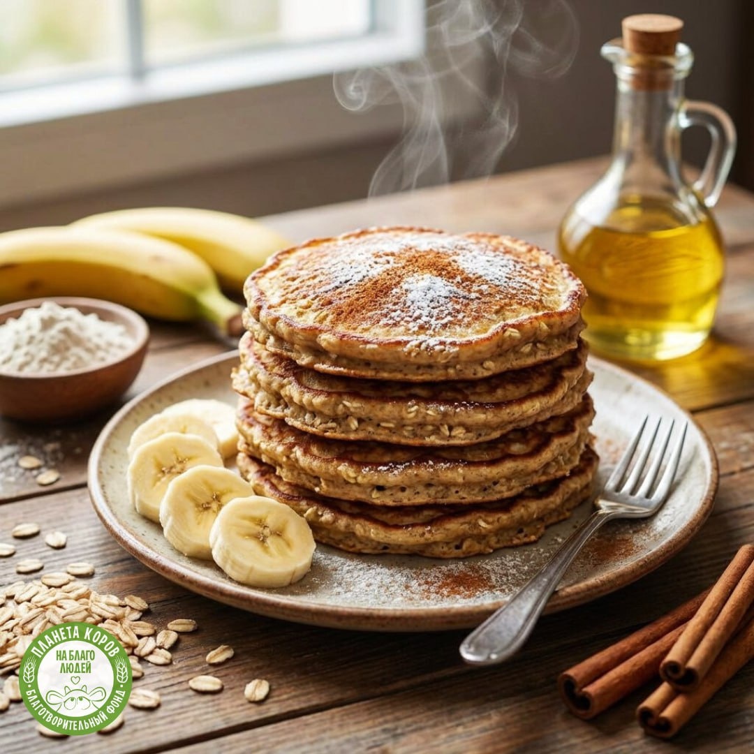 Постные банановые оладьи Ингредиенты Банан - 1 шт. (170 г) Вода – 250 мл Пшеничная мука - 160-170 г Овсяные хлопья – 40 г Масло подсолнечное – 1 ст.л. + для жарки Сахар - 40 г Соль - 0,5 ч.л. Корица – 1 ч.л. Разрыхлитель – 2 ч.л. Ржаные отруби – 1 ст.л. Очистите банан от кожуры. Нарежьте произвольными кружочками в глубокую миску. Возьмите вилочку и хорошо разомните. К банановому пюре налейте воду комнатной температуры и перемешайте. В глубокую миску просейте муку. Добавьте измельченные в блендере овсяные хлопья, соль, разрыхлитель, корицу, ржаные отруби, сахарный песок. Перемешайте ручным венчиком, чтобы все сухие ингредиенты равномерно распределились в мучной смеси. К сухим ингредиентам налейте жидкую часть и хорошенько перемешайте. Добавьте подсолнечное масло. Еще раз перемешайте. Должна получиться густоватая масса. Оставьте тесто на минут 10. Разогрейте масло в сковороде. Выложите ложкой тесто. Уменьшите огонь, накройте сковороду крышкой. Жарьте до золотистого цвета с обеих ст