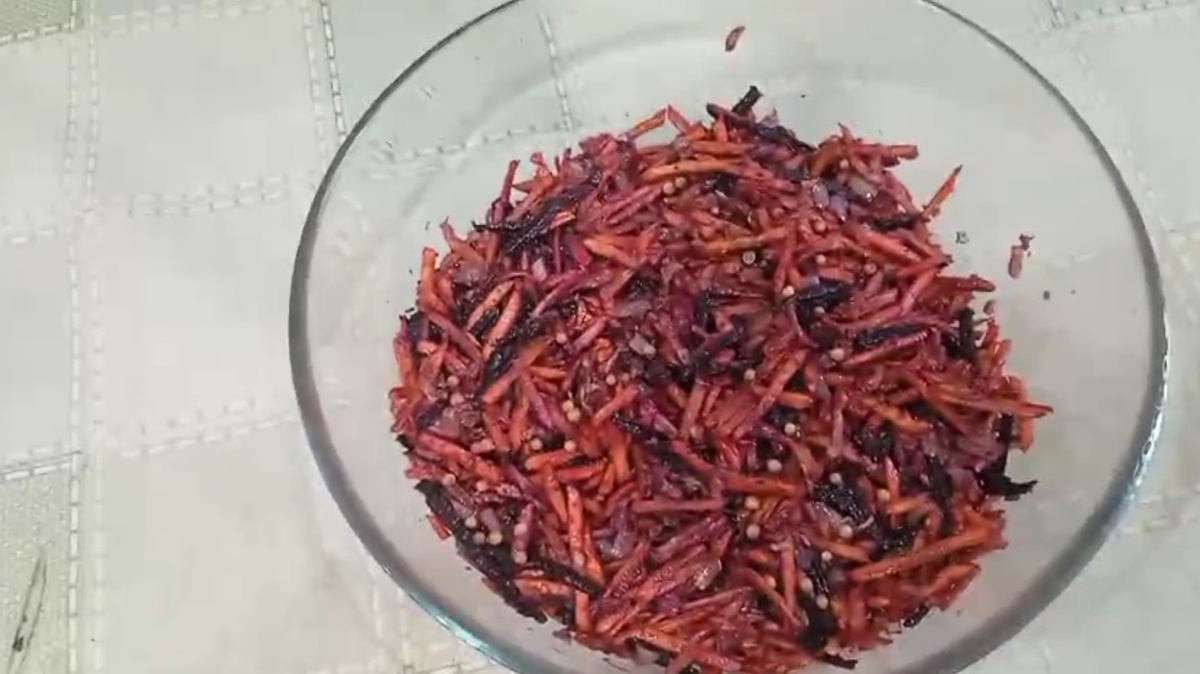 Дорогие мои подписчики и гости моего канала сегодня я покажу вам как готовлю салат под названием морковча. У этого салата нет строгих пропорций берите все ингредиенты ориентируясь на свои вкусовые предпочтения. Для салата «морковча» я использую морковь обычную оранжевую и фиолетовую. Натираю морковь на терке для корейской моркови, но не длинной лапшой, а короткими перьями. Для этого ставлю морковь под небольшим углом к терке. если нет такой терки, морковь можно натереть и на обычной крупной терке. Дальше морковь солю, добавляю уксус и все хорошо перемешиваю. Затем в середине делаю небольшое углубление натираю туда на мелкой терке чеснок (можно его и через пресс пропустить), насыпаю сухую смесь приправы для корейской моркови. Теперь нарезаем лук мелким кубиком и пассеруем его в масле до полупрозрачности (жарить его не нужно) и затем пассерованный лук с раскаленным маслом наливаем на сухие специи. От раскаленного масла специи раскроют свои ароматы и вкусы. Все хорошо перемешиваем и пр