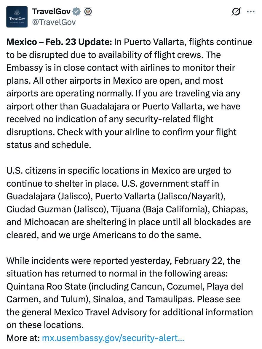 ‘US citizens in specific locations in Mexico are urged to continue to shelter in place’ ‘While incidents were reported yesterday, February 22, the situation has returned to normal in the following areas…’