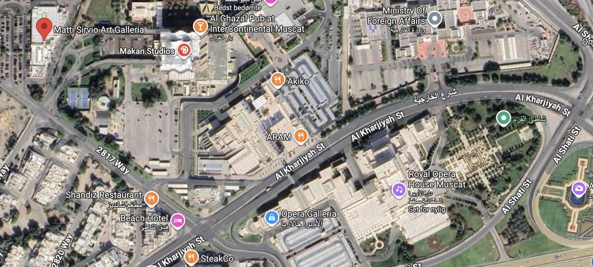 Я увидела эти картины в галерее Matti Sirvio Art Galleria в Маскате, столице Омана, недалеко от Оперы. Здесь есть галерея, совсем маленькая, из одной комнаты. В ней выставлены картины художника-абстракциониста Matti Sirvio. Эту картину я сфотографировала через стекло. Как вы видите, в нем отражается ёлочка, потому что как раз Рождество, Новый год и еще Рождество - оманцы не сильно в этих тонкостях разбираются, потому что мусульмане, однако ёлок везде понаставили, вот где толерантность! Картина называется Курбан-Байрам. Кто не знает - это мусульманский праздник, на котором кроме всего прочего приносят в жертву животных. Мне кажется, на картине видны очертания коровы или быка, которого человек ведет на заклание. Но атмосфера картины - не трагичная, а яркая и праздничная, так как это событие имеет большое значение для мусульман. По другим картинам художника видно, что он любит яркие насыщенные цвета. Картины оставляют место для собственной фантазии зрителя: На темной стене- более спок