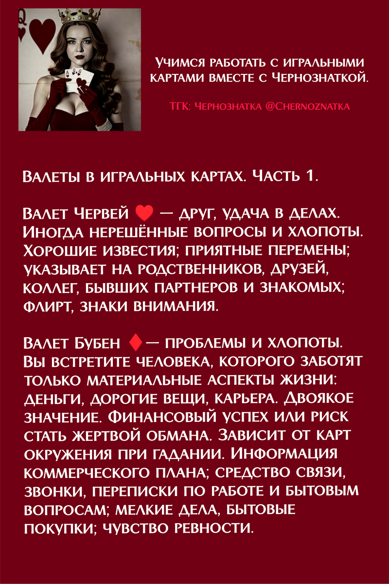Валет Червей ♥️ —друг, удача в делах. Иногда нерешённые вопросы и хлопоты. Хорошие известия; приятные перемены; указывает на родственников, друзей, коллег, бывших партнеров и знакомых; флирт, знаки внимания.