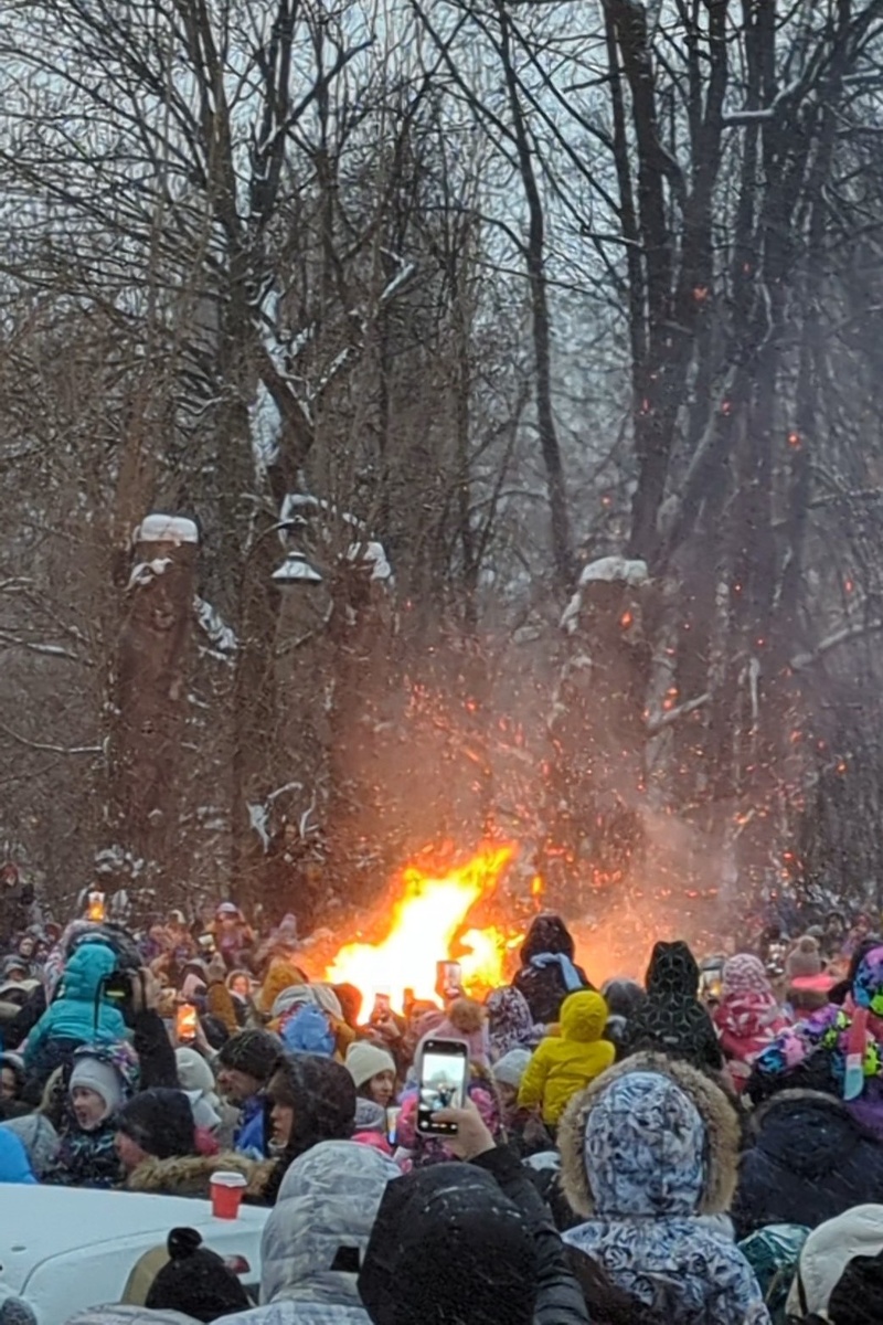 В итоге мы заняли место чуть в стороне на небольшой горке. Было видно верхнюю часть чучела и толпу людей, но разгоревшийся костер был заметен уже лучше.