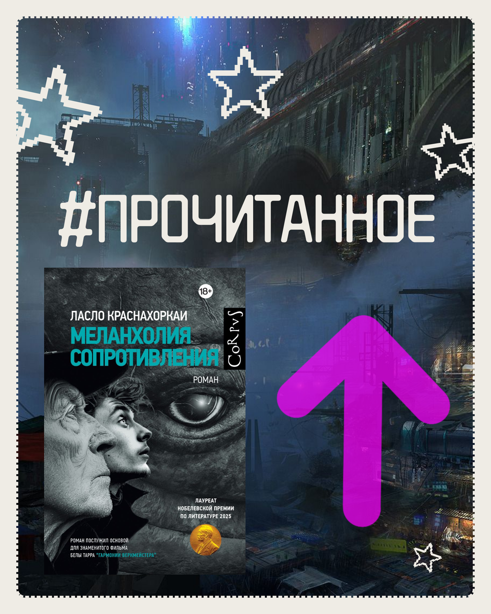 📄 Ласло Краснохоркаи, Меланхолия сопротивления 📄 Случайная цитата: "Уже сейчас есть только ничего". 📄 Краткое содержание: Странный цирк, гвоздь программы которого – чучело исполинского кита, прибывает в маленький венгерский городок. И вслед за ним в город стекаются маргиналы, желание которых - крушить всё, что они видят. 📄 Ласло Краснахоркаи - нобелевский лауреат прошлого года. Он получил премию за свои антиутопические произведения. Я люблю антиутопии, но с творчеством Краснахоркаи у меня, честно говоря, не сложилось. И наверное, это первое и последнее произведение автора, больше я с ним знакомиться не хочу. 📄 Пожалуй, эта книга уже сейчас кандидат на худшие книги года. Я с большим трудом продиралась сквозь длинные и перегруженные словами предложения. Да, они написаны красиво, но у меня было ощущение, что я сейчас засну, когда я читала все эти словесные экзерсисы. 📄 Любопытный поначалу сюжет - гигантский кит в маленьком городке, маргинальная вакханалия, в финале книги не привод
