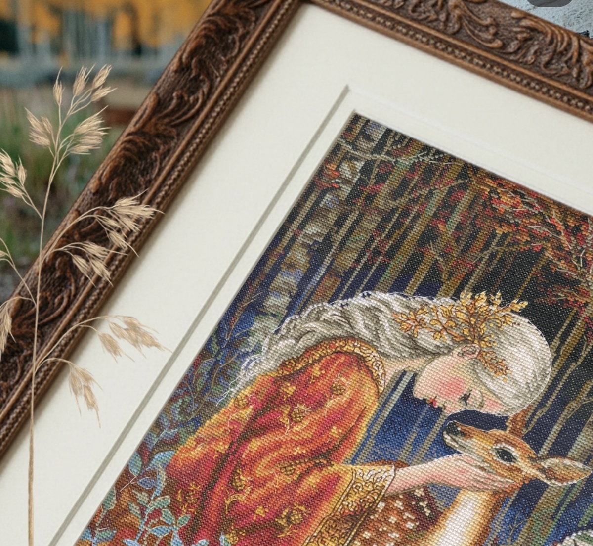 Увидела я случайно новинки от фирмы РТО. До чего же красивые они! Сразу возникла мысль, что хочу ими поделиться и с вами. Свои грустные статьи мне бы хотелось разнообразить такой вот красотой. Ну и помечтать, чтобы я вышила из этих сюжетов. Сейчас мои вышивальные покупки будут крайне редкими, но думаю, что меткими. Покупать буду те наборы, которые вот точно пришлись по душе. А то я не привередливая вышивальщица и мне нравится всё. У меня сейчас цель: вышивать то, что есть уже у меня; дошить все свои процессы (почти все). А если уж и покупать что-то из новинок, то чтобы сразу и вышить. Эта новинка очень красивая! Это точно мой фаворит из новинок РТО. Здесь есть всё то, что я так люблю: осень, красивая девушка в необычной накидке. Цветовая палитра очаровательных оттенков. Цвета не яркие, немного приглушённые, по-осеннему очаровательные. Картина очень атмосферная, с отличной проработкой. А если ещё и учесть, как мне нравится полная зашивка у данного производителя, то уверена, что рабо