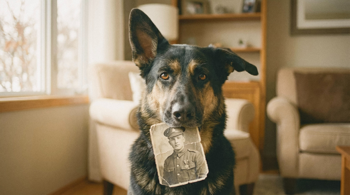 Михаил Степанович медленно взял фотографию. Провёл пальцем по лицу солдата. И молчал. Полкан сел рядом с ним, положил тяжёлую голову ему на колено. Дед машинально погладил пса по загривку.