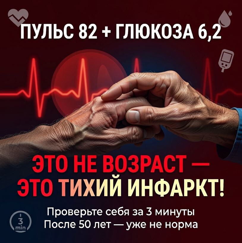 Многие врачи говорят: “для вашего возраста норма”. Я поясняю, когда это уже тихий разгон инфаркта. 61-летний Сергей Николаевич вышел от врача довольным: «Глюкоза 6,2, пульс 84 — для вашего возраста отлично». Через 8 месяцев — инфаркт. Не самый тяжёлый, но настоящий. Оказалось, эти «почти нормальные» цифры давно складывались в опасный сигнал. Врач просто не успел их сложить. А ваши цифры уже кричат об опасности? Сердце при 80 ударах делает ~115 000 сокращений в сутки. При 60 — всего 86 000. Разница — почти 30 000 лишних ударов каждый день. За год — больше 10 миллионов лишних ударных нагрузок на сердце и сосуды. Это не мелочь. Хронически высокий пульс = постоянный лёгкий стресс организма (симпатикотония). Кортизол повышен, инсулин работает хуже, сосуды напряжены. Это замкнутый круг, который ускоряет атеросклероз: Framingham Heart Study подтвердил: пульс в покое >80 это независимый предиктор сердечно-сосудистой смерти. Даже без других