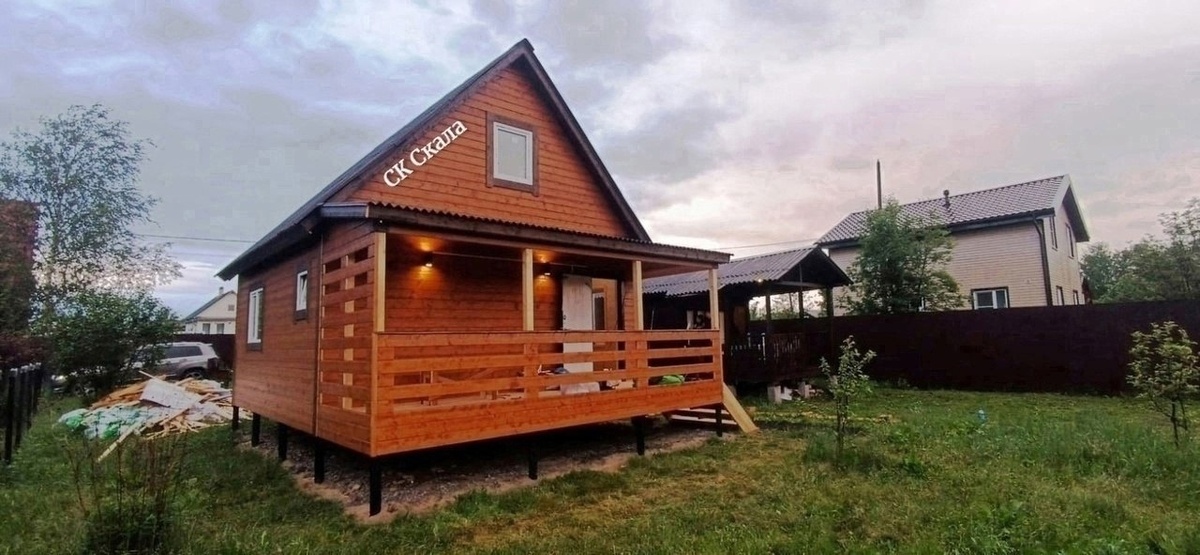 На фото утеплённый каркасный дом с мансардой, цены за тёплый контур с отделкой для размера 6х6 м с верандой 2х6 м