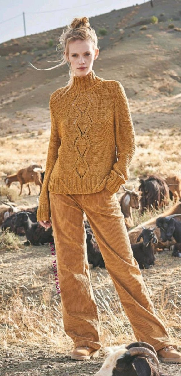 Пуловер горчичного цвета с воротником-стойкой и длинными рукавами , обыгрывающий линию бедер