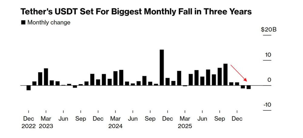 В предложении стейблкоина USDT самое сильное сокращение со времен краха FTX. Tether пока не ответил на запрос о комментарии -- BBG
