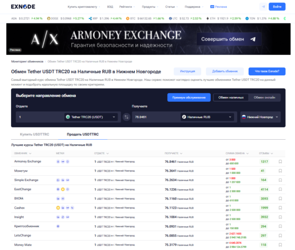 Exnode - сайт мониторинга криптообменников Нижнего Новгорода