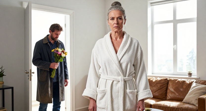Она стояла посреди своей — именно своей — гостиной. В старом халате, с собранными в пучок волосами, без макияжа. И выглядела не как брошенная женщина пятьдесят пять плюс, а как прокурор, который уже всё доказал, просто ждёт, когда подсудимый сам это поймёт.