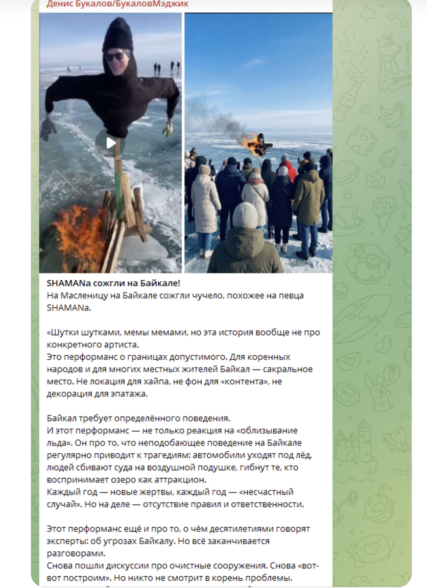 Мэджик Денис Букалов заявил, что сжигание чучела артиста Дронова- это перфоманс не только на облизывание льда Байкала