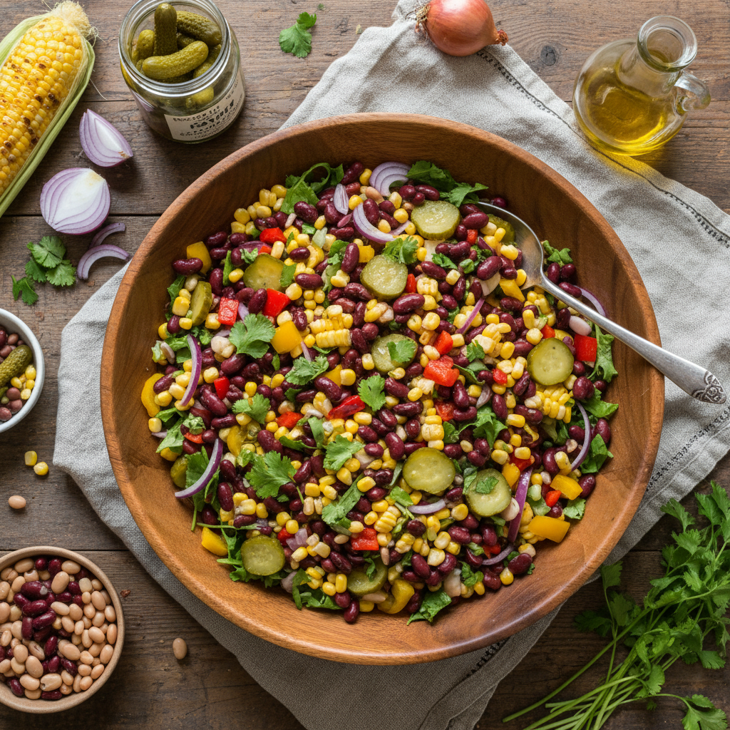 - Фасоль + кукуруза + маринованный огурец + лук + майонез