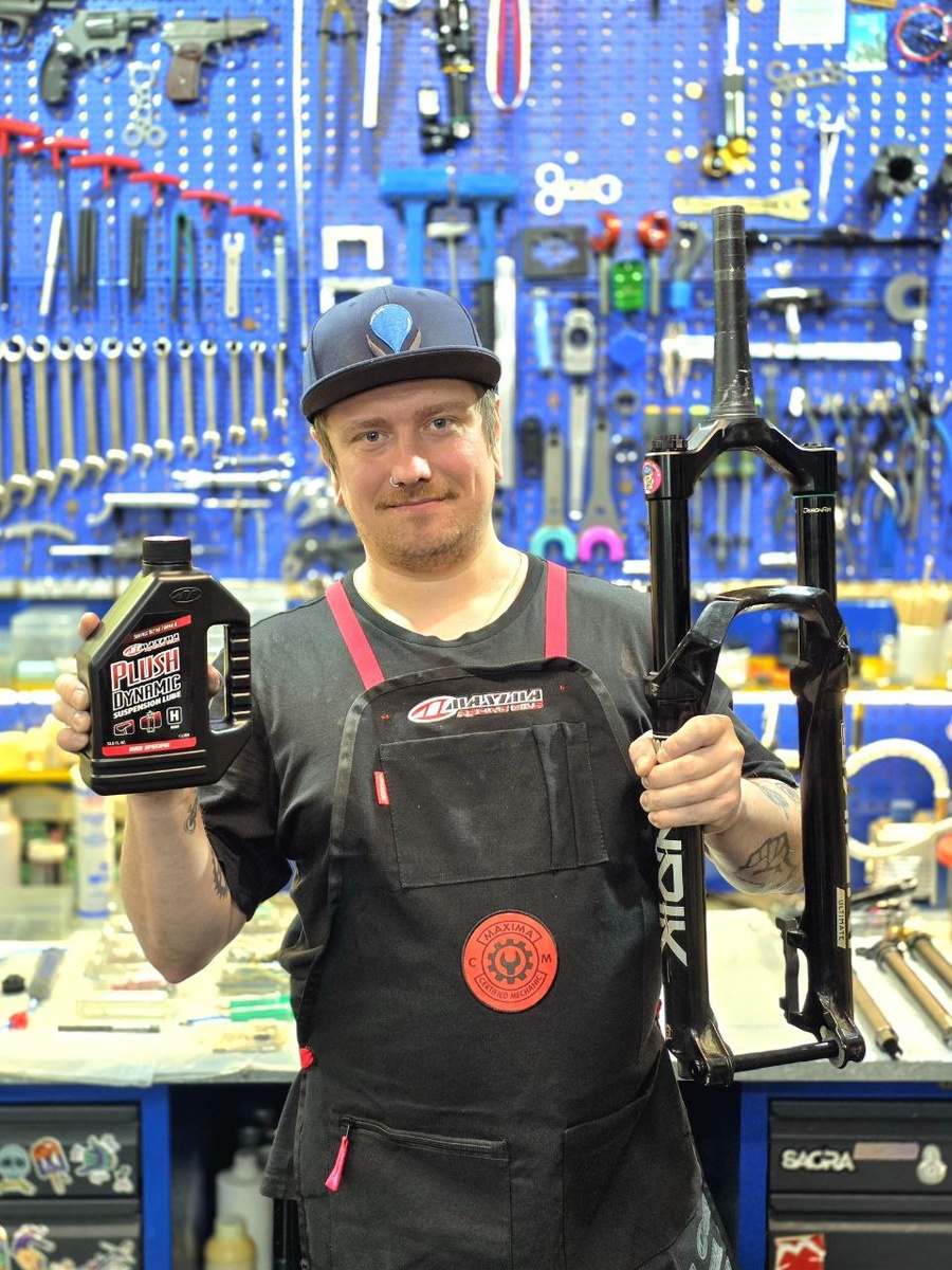 Вчера днём, прямиком из Находки, к нам прилетели 5 коробок отменного подвесочного масла и новые рабочие фартуки, теперь я наконец-то могу вылить последнюю банку масла из прошлой партии в карманы прежнего фартука, и, выкинув всё это в мусорный контейнер, надеть на себя новую униформу и открыть новую банку Максимы. Ура! На правах пресс-секретаря нашей мастерской также напомню, что мы открыты к сотрудничеству с российскими и не очень производителями масел и материалов для проведения работ с велосипедными компонентами. Если вы представитель фирмы, и вам интересно сотрудничество с харизматичными работягами из ближнего Подмосковья, пишите, не стесняйтесь, буду рад диалогу)